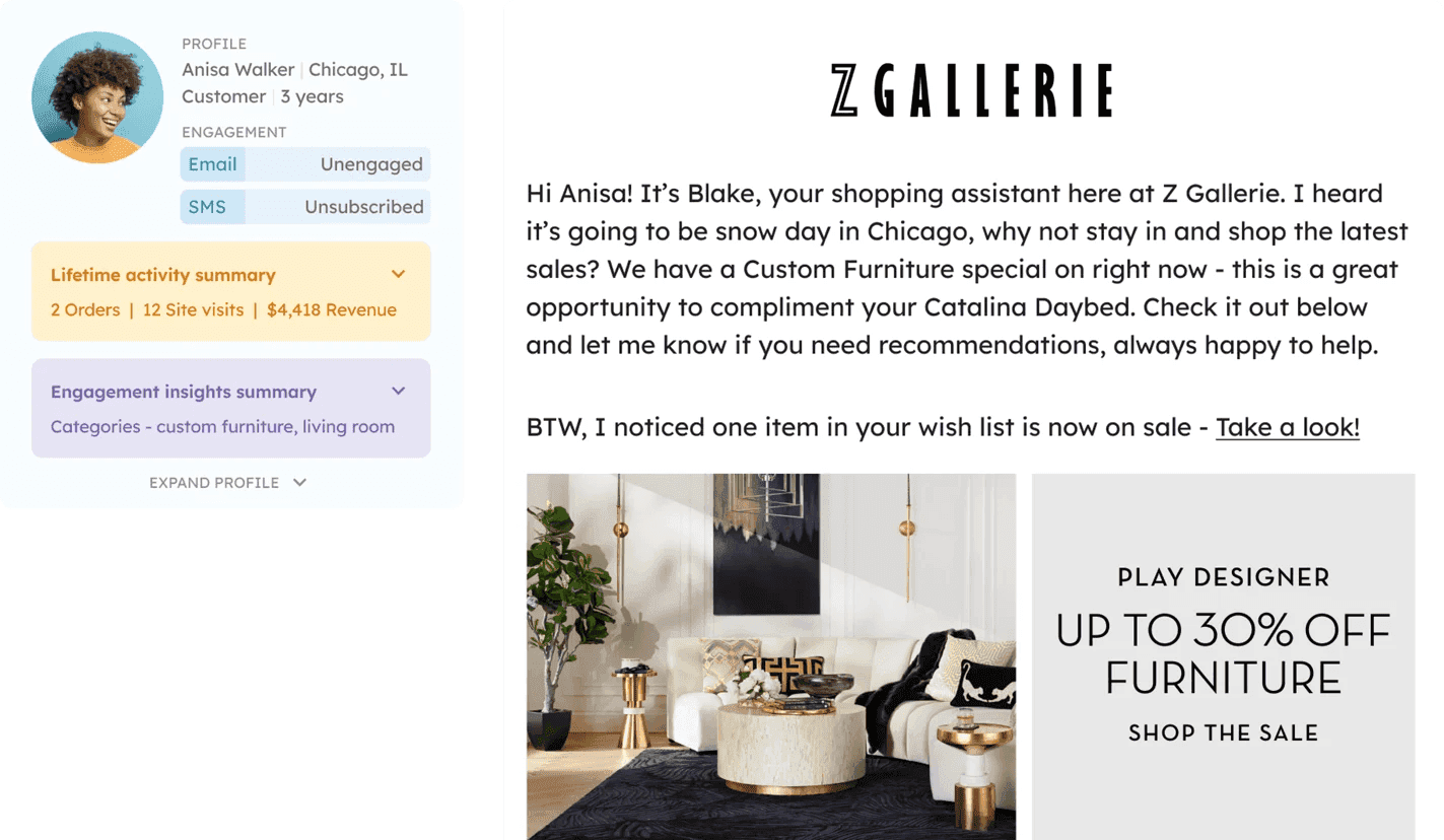 Adjust messaging based on purchase history: Offer product recommendations based on past purchases or suggest complementary items.